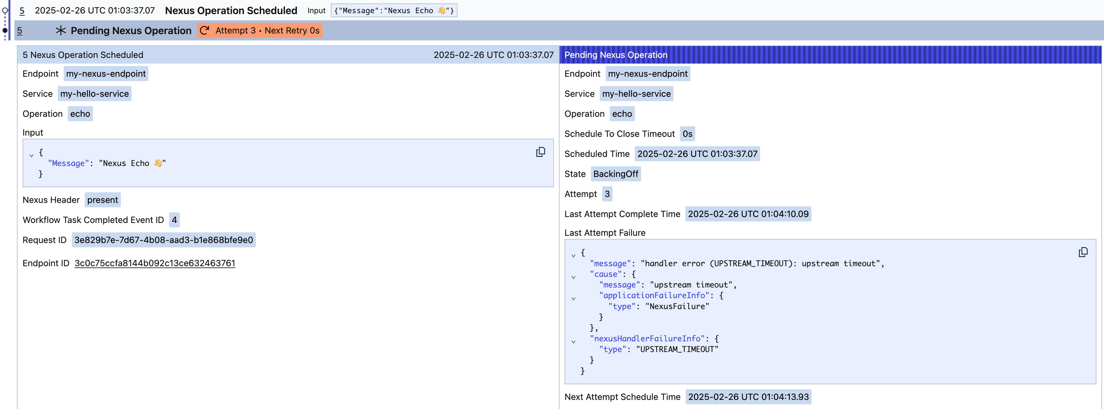 Retryable Nexus errors returned from a Nexus handler will surface as part of the Pending Operation in a caller Workflow. Non-retryable errors will result in the Nexus Operation reaching a final state in the caller Workflow, with a Failed, TimedOut or Canceled event.